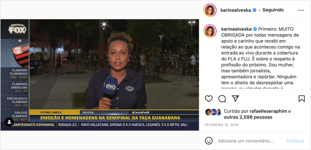 No lugar de jornalistas mulheres, é sempre uma honra escrever sobre uma colega de profissão, principalmente se for uma figura tão importante como a Karine. Mas, ao mesmo tempo, é preciso revisitar muitos sentimentos que doem em todas nós. A Karine não é a primeira, e, infelizmente, não é a última jornalista a sofrer com o assédio, racismo e o preconceito de tantas outras formas. Desde que escolhemos trabalhar com o esporte nós somos expostas diariamente a diversas violências, e a sensação é de que nada está sendo feito para que sejamos protegidas disso. Apesar do cansaço e do esgotamento, a gente luta, sempre, para que o jornalismo esportivo possa se tornar um lugar que acolha e respeite as mulheres e que, acima de tudo, se torne uma profissão com uma presença significativa e um local de pertencimento para meninas e mulheres que sonham em comunicar o esporte.