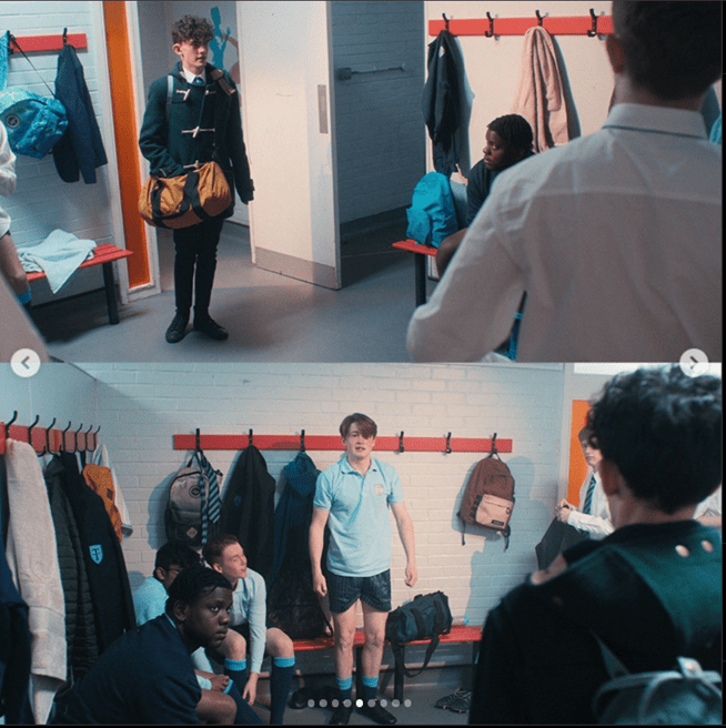 Cena da chegada de Charlie ao vestiário do time de rugby pela primeira vez