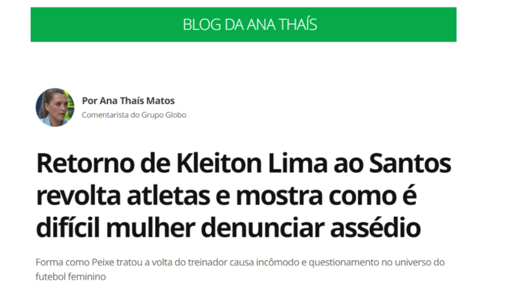 MATOS, Ana Thaís. Retorno de Kleiton Lima ao Santos revolta atletas e mostra como é difícil mulher denunciar assédio. GE, São Paulo, 09 abr. 2024. Disponível em: https://ge.globo.com/blogs/blog-da-ana-thais/post/2024/04/09/retorno-de-kleiton-lima-ao-santos-revolta-atletas-e-mostra-como-e-dificil-mulher-denunciar-assedio.ghtml. Acesso em: 24 nov. 2024