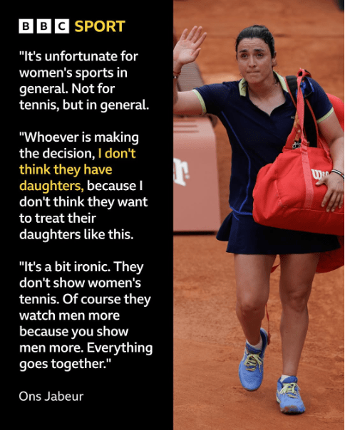 Recentemente, durante a disputa de Roland Garros, a tunisiana Ons Jabeur, antiga número 2 do mundo, criticou duramente a organização do Grand Slam francês por não colocar jogos do circuito feminino nas rodadas noturnas da Quadra Central, afirmando que esta medida é “lamentável para o esporte.” O presidente da Federação Francesa, Gilles Moretton, tentou se defender afirmando que não coloca jogos femininos nas rodadas noturnas da Quadra Central pois “é preciso colocar a melhor partida por causa do público.”