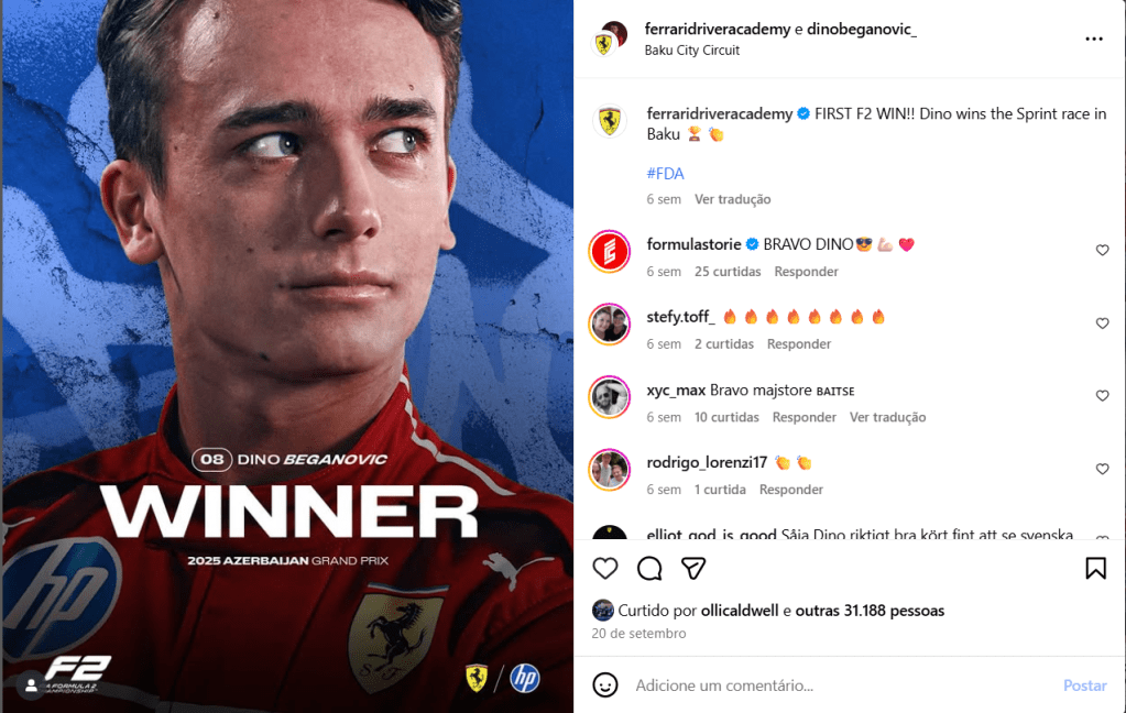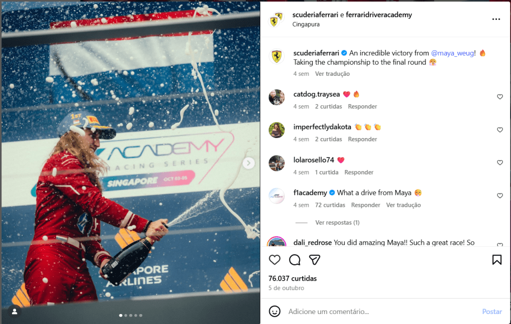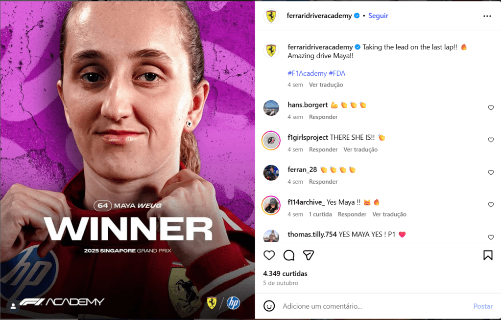 No dia 5 de outubro, por exemplo, a postagem celebrando a vitória de Maya Weug na F1 Academy, em Singapura, somou 4 mil curtidas e 29 comentários. Em contraste, no dia 20 de setembro, a vitória de Dino Beganovic na FIA Fórmula 2 recebeu 31 mil curtidas e 108 comentários. Mesmo a conquista anterior de Maya, publicada em 31 de agosto, também na F1 Academy, obteve 5 mil curtidas e 56 comentários, números expressivos, mas ainda bem abaixo dos alcançados por Dino.