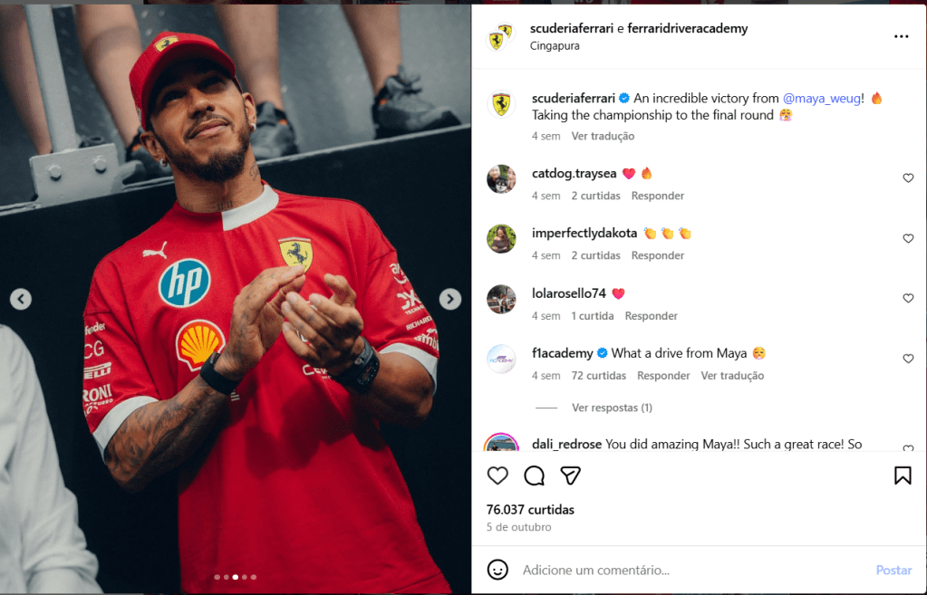 O post da Ferrari Driver Academy que celebra a vitória de Maya na F1 Academy evidencia, à primeira vista, uma tentativa de promover a presença feminina no automobilismo, um espaço historicamente dominado por homens. No entanto, a escolha de incluir uma imagem de Lewis Hamilton, ainda que ele seja uma figura importante no esporte e símbolo de representatividade racial, acaba desviando o foco da protagonista do post. Em vez de reforçar a conquista individual de Maya, a publicação acaba centrando a narrativa em uma figura masculina já consolidada, reproduzindo, mesmo que de forma sutil, a lógica de apagamento simbólico das mulheres nesse contexto.